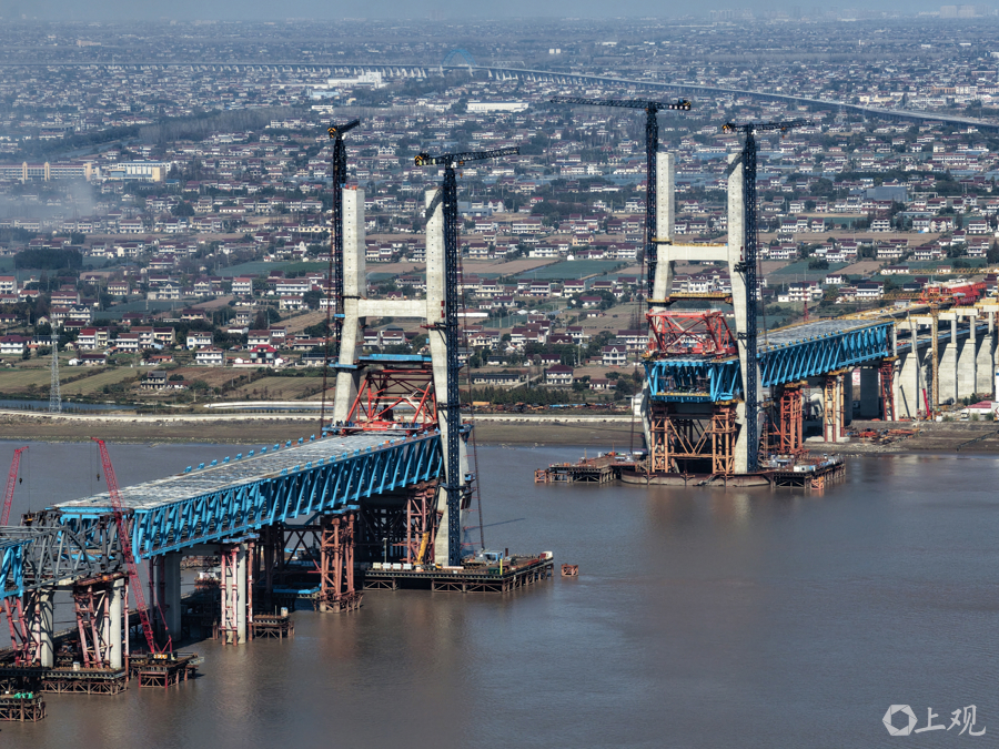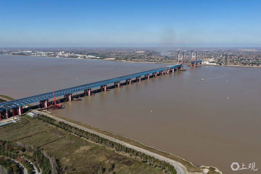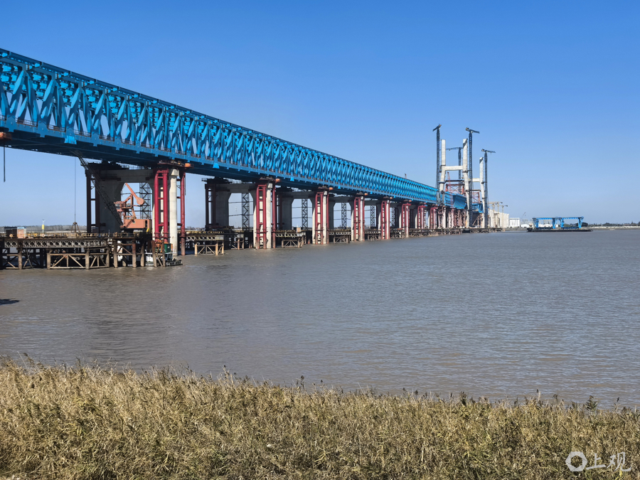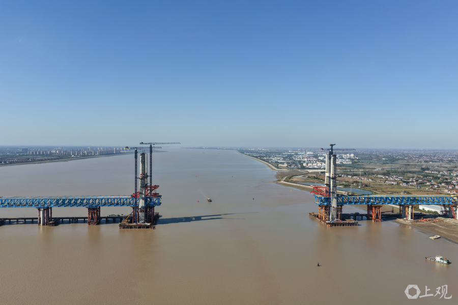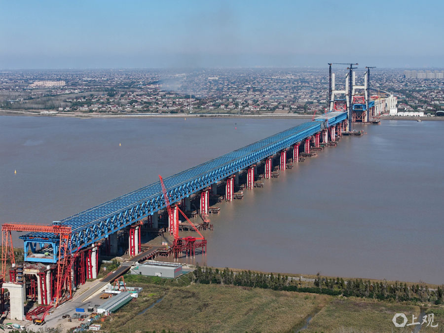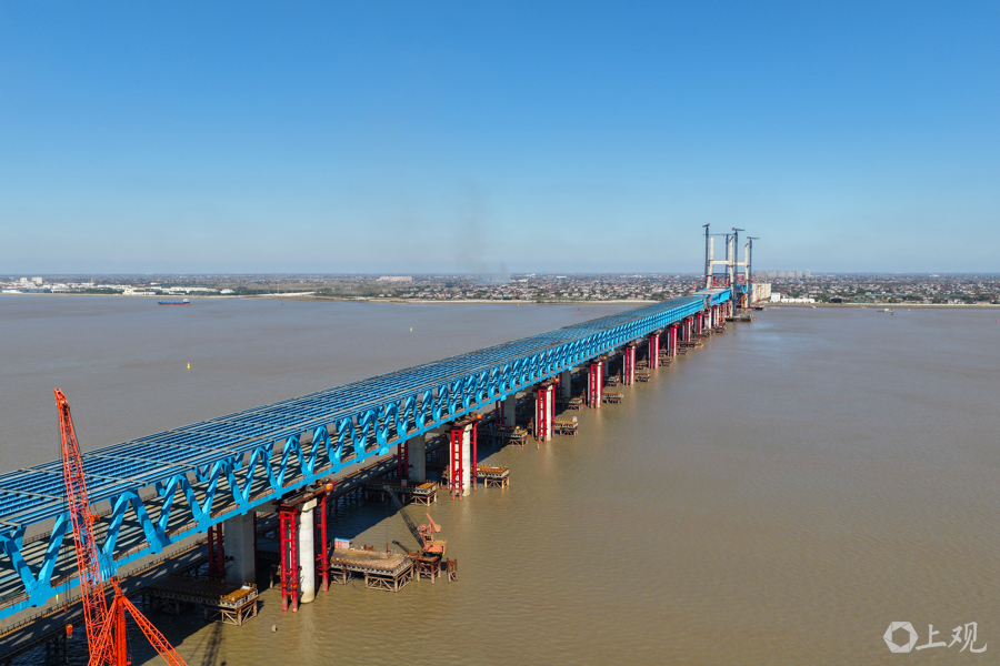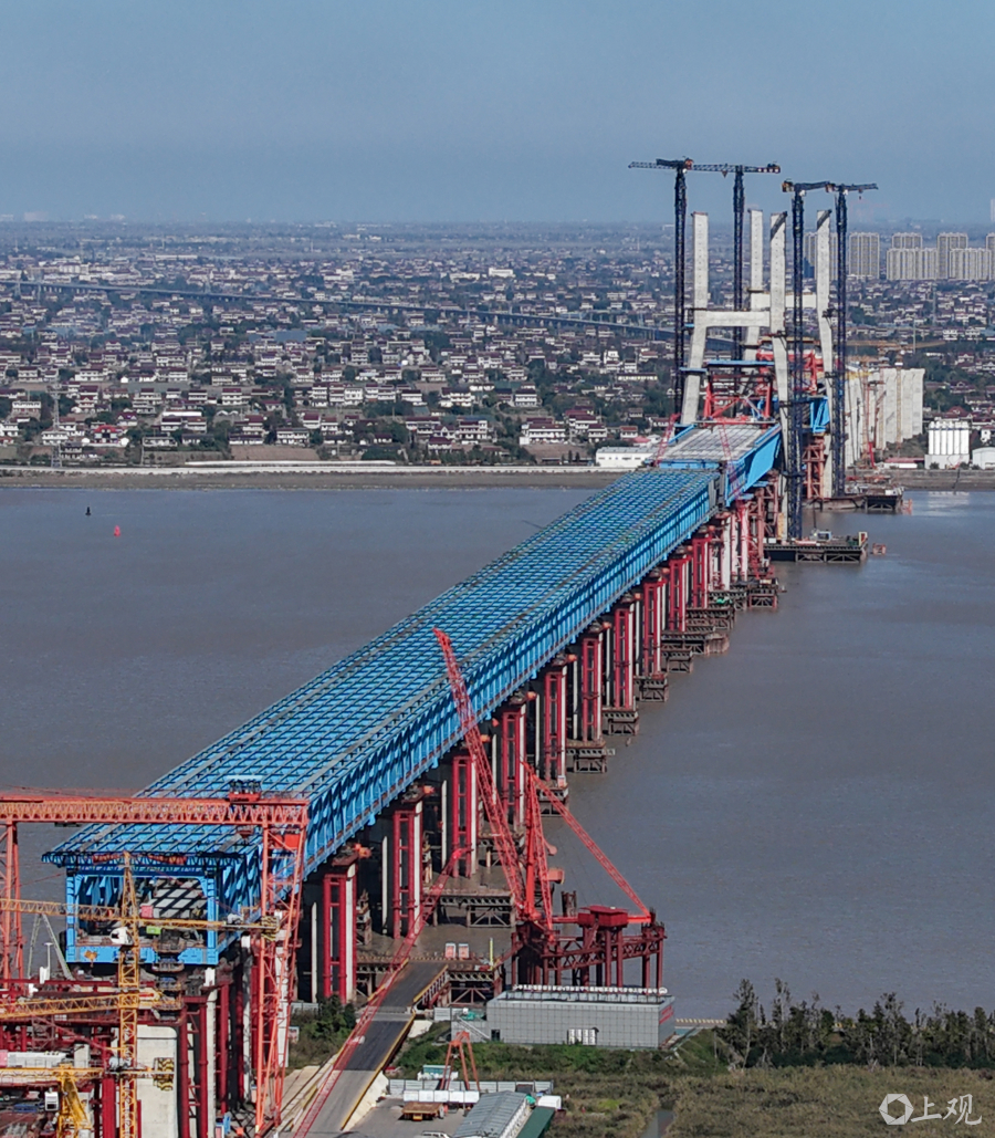 近日,沪渝蓉高铁控制性工程崇启公铁长江大桥建设迎来双重突破:153米高的3、4号双主塔已顺利封顶,非通航孔钢梁全部架设完成并进入最后一轮顶推阶段,项目建设全面提速。