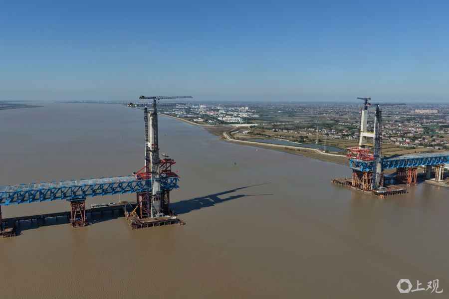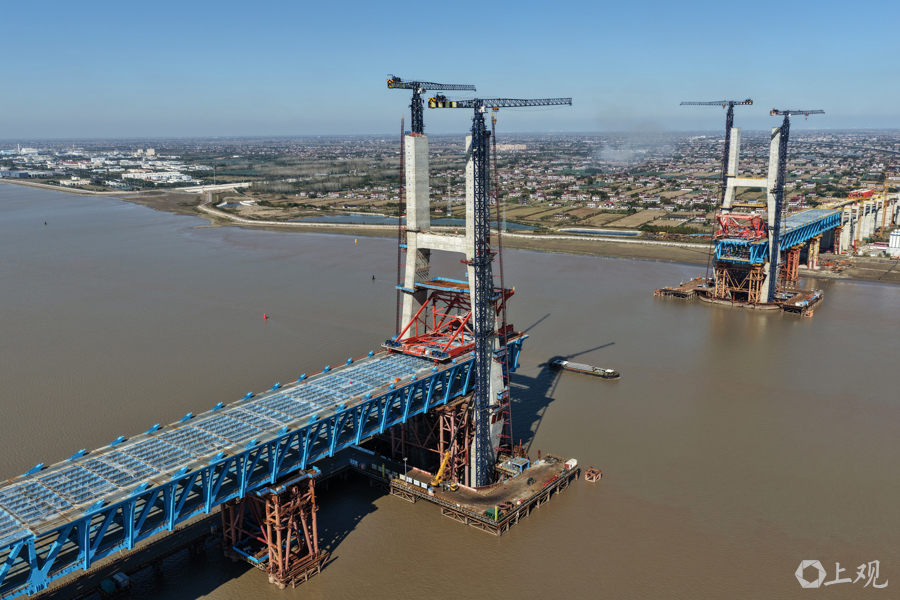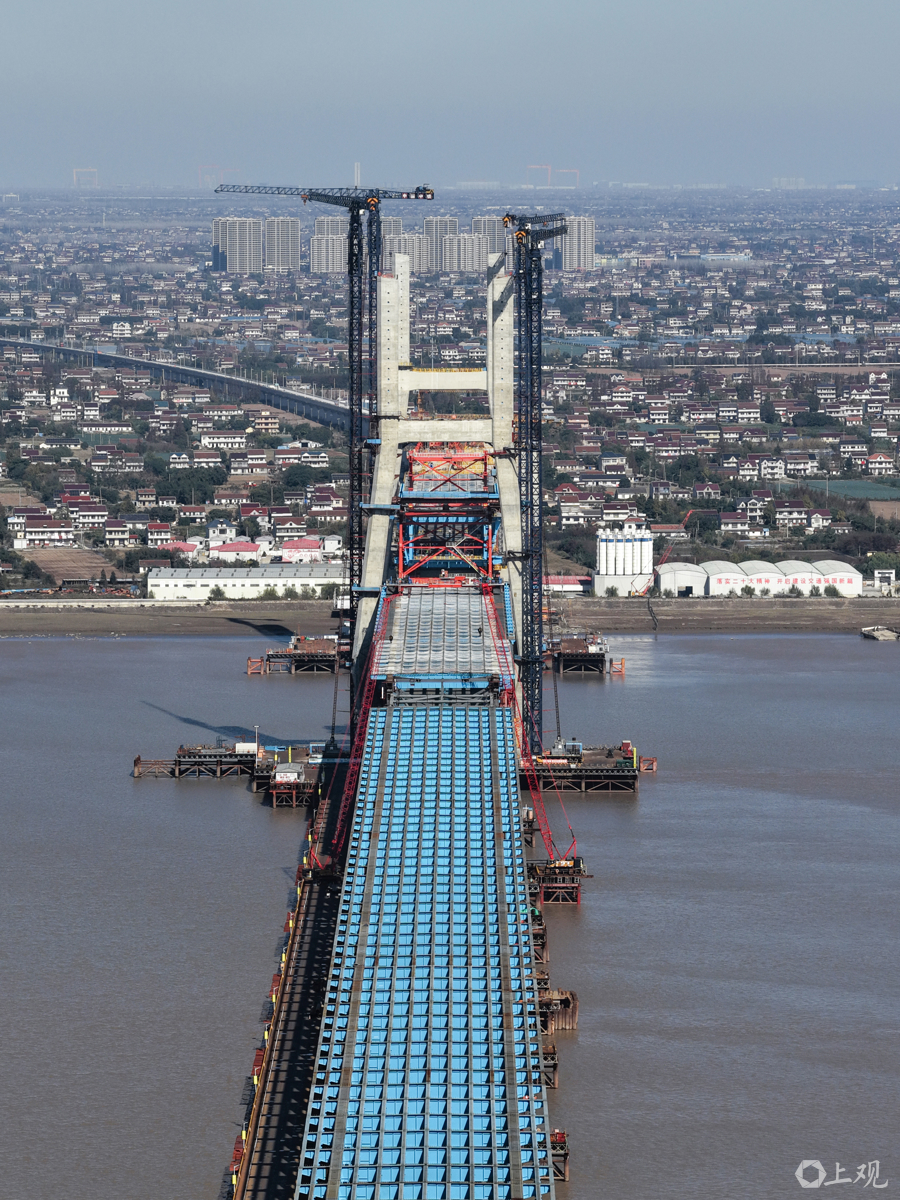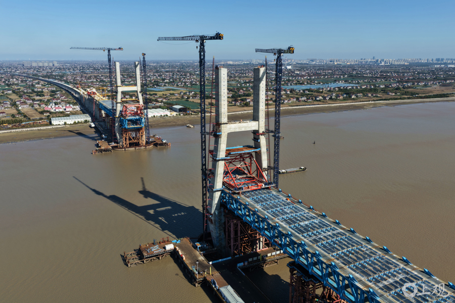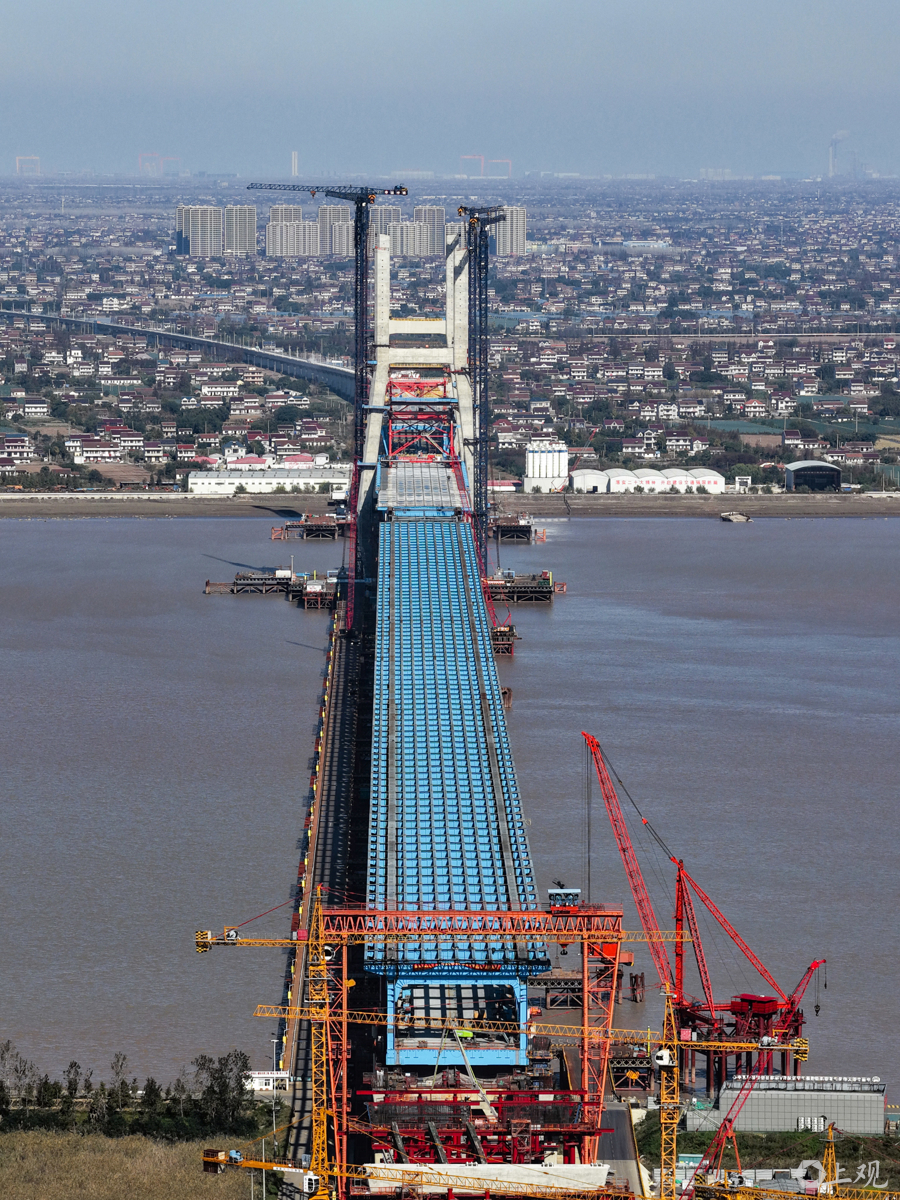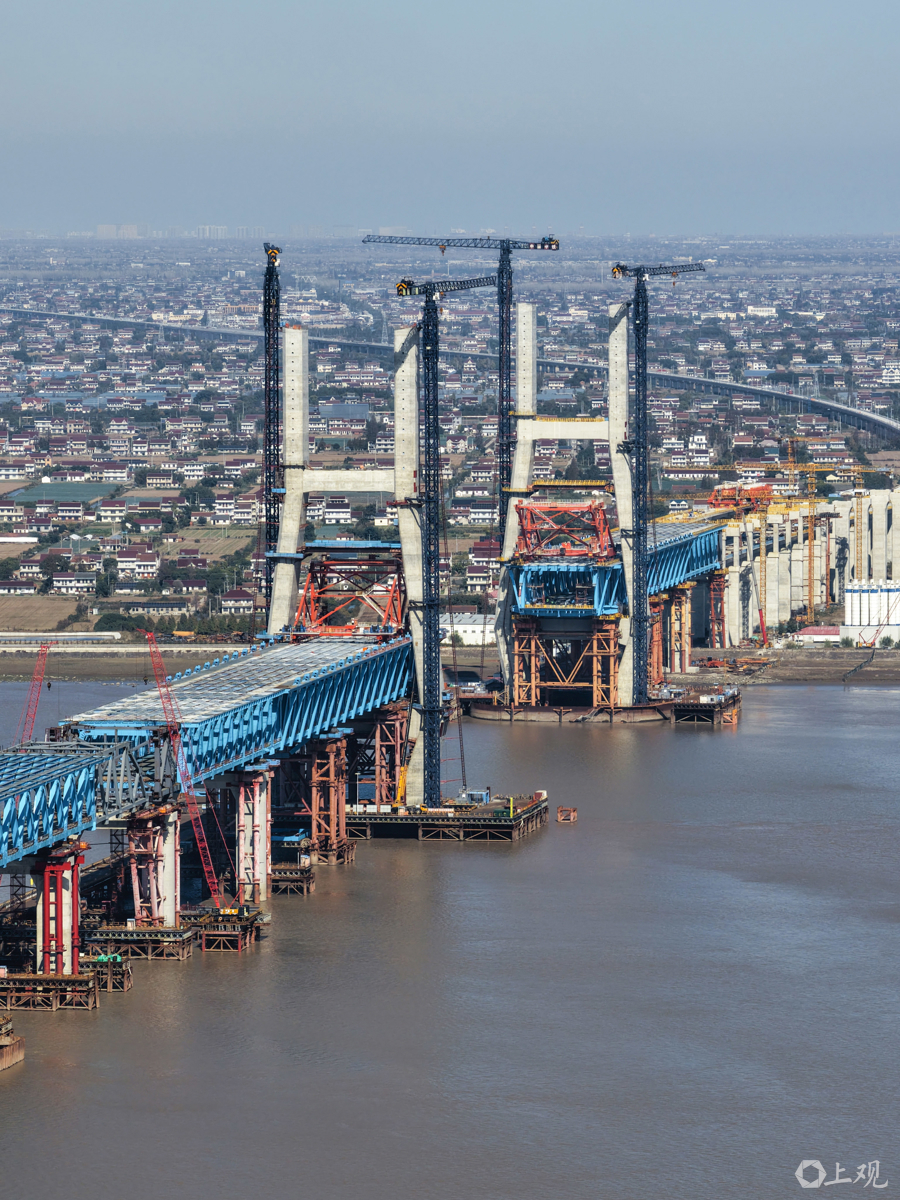 目前项目已完成总工程量的80%,正推进斜拉索挂索与钢梁合龙准备,预计明年3月实现崇明岛与启东侧钢梁“牵手”。大桥上层为双向六车道公路,下层通行350公里时速高铁及250公里时速城际铁路,建成后将大幅缩短长三角城市时空距离,启东至上海车程仅需25分钟。