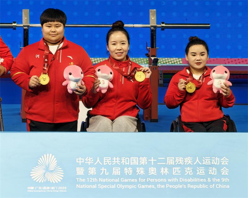 12月3日,河北运动员郑飞飞(左)、石珊珊(中)、郭玲玲在全国第十二届残运会举重女子团体比赛赛后颁奖仪式上。河北日报记者 王伟宏摄
