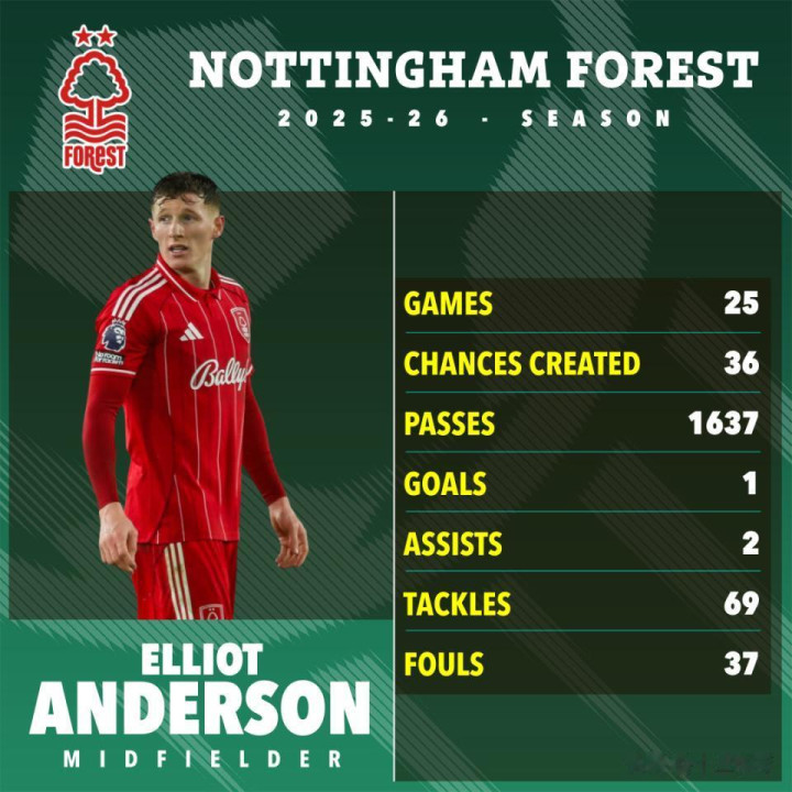 当然,这种高防守数据必须结合背景来看。诺丁汉森林是英超控球率最低的球队之一,这让安德森获得了更多防守动作机会。他在犯规次数上也偏多,仅次于卡塞米罗。