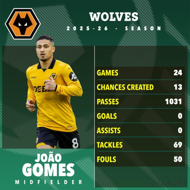 这位24岁的中场同样具备不错的带球能力,但在向前传球方面贡献有限。当然,这必须结合狼队整体进攻能力不足的现实来看。